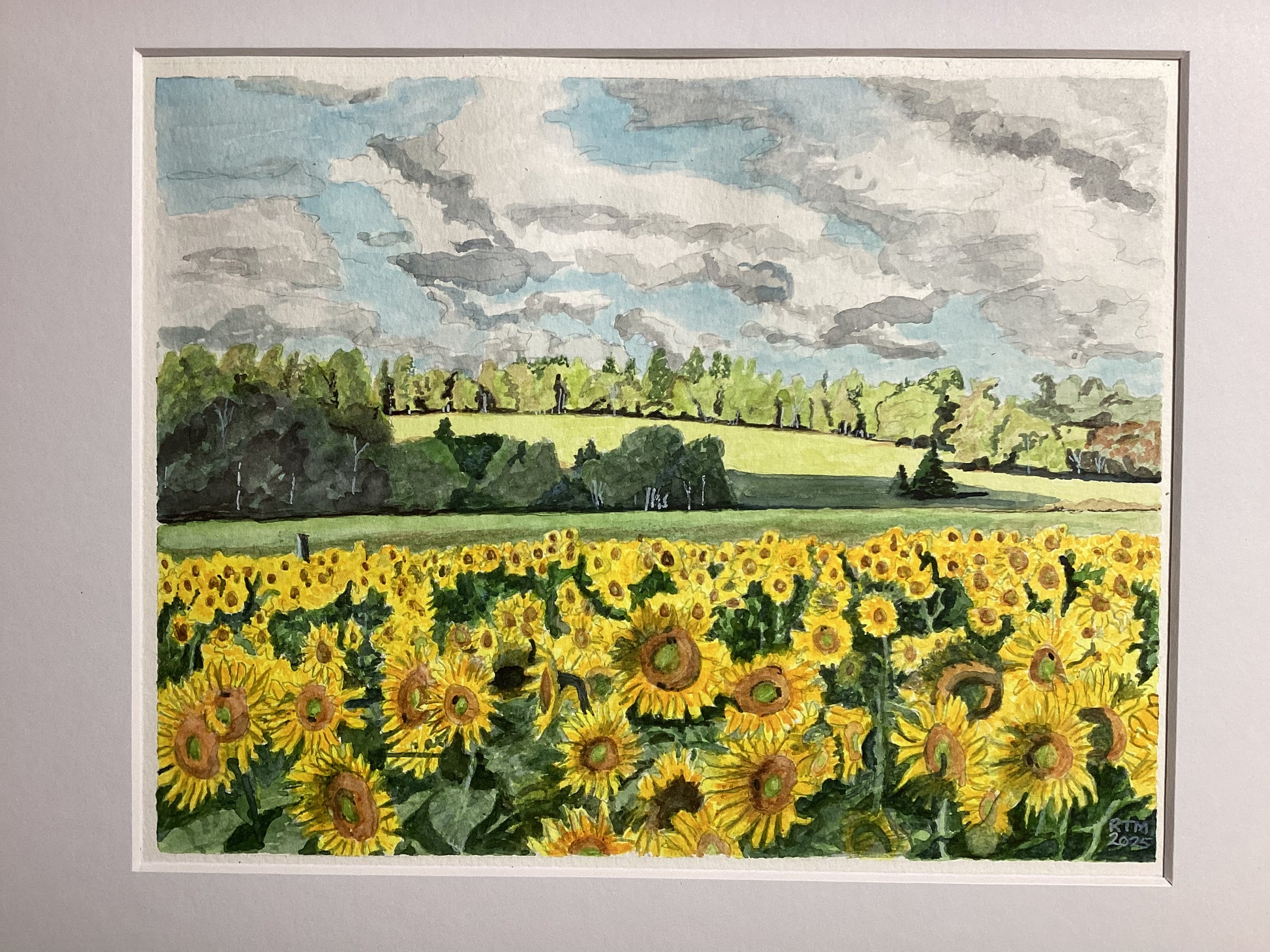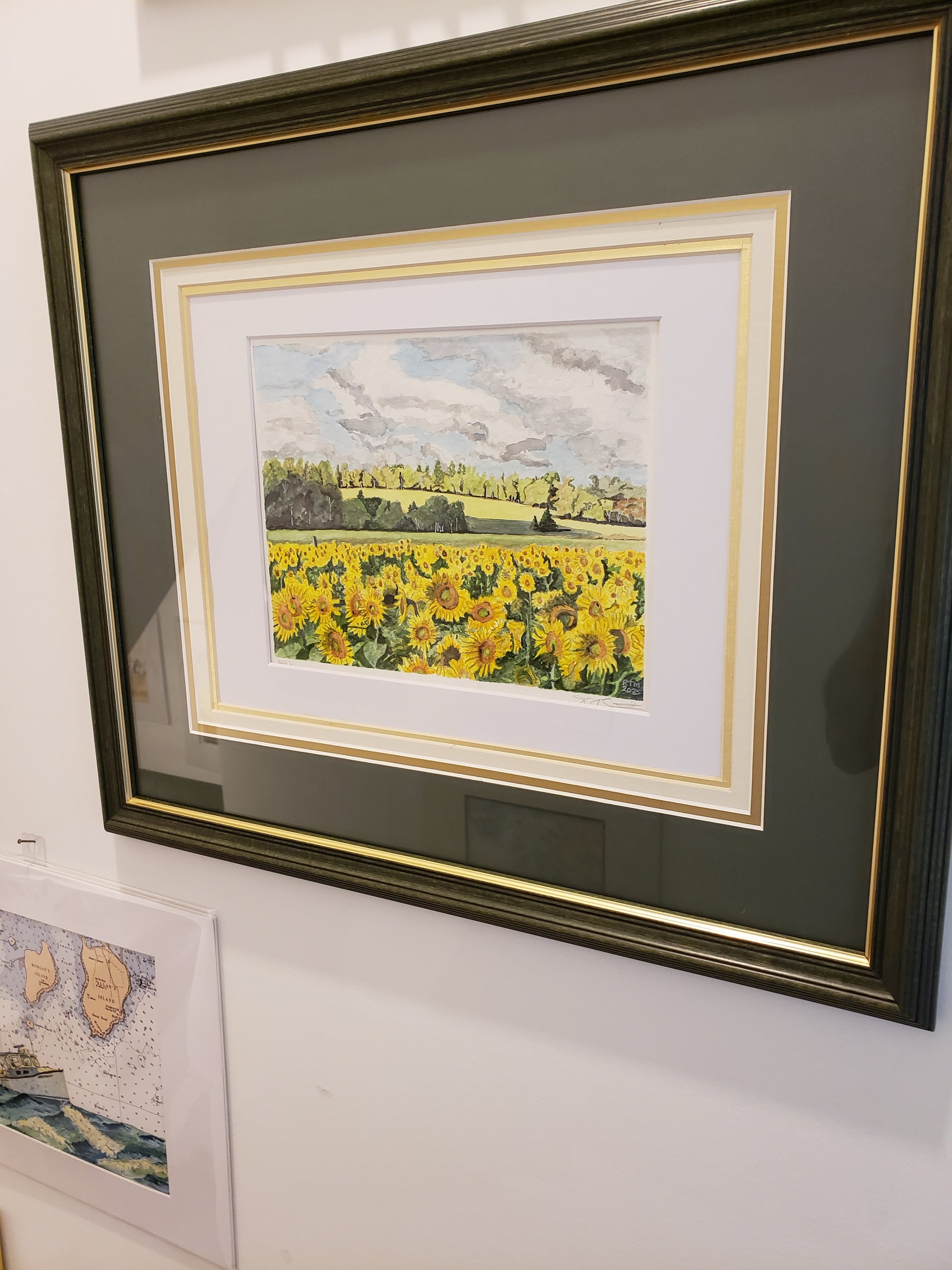 This scene is what caught my attention as a subject to paint. The numerous sunflower, contrast in colour, and shading make it an excellent study. The flowers became the challenge as there is over 160 of them. So this original watercolour painting is 8”x10”, and when I came to matting it I found I had the perfect frame for it. So it has an exceptional quintuple matting in a 20”x18” frame.