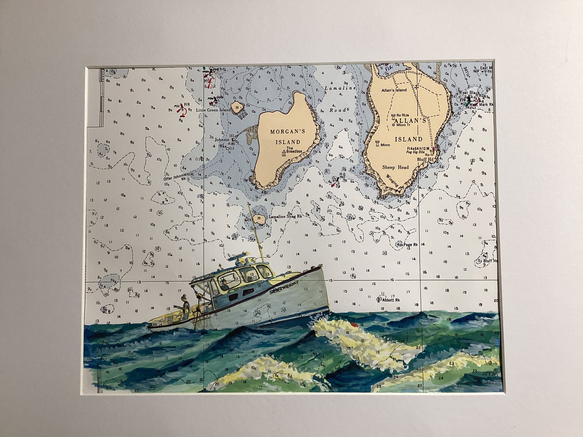 An original watercolour painting on nautical chart paper of an iconic cape islander fishing boat in rough waters. The vessel is involved in lobster fishing as it approaches a bouy. I had some fun with the naming of the boat.